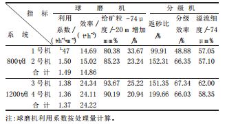 一般來說,除球磨機(jī)規(guī)格、新給礦量和鋼球等因素以外,物料在磨機(jī)內(nèi)停留時(shí)間主要決定于返砂比和給礦、返砂沖洗水量。1號(hào)機(jī)因返砂比低,排礦和返砂中細(xì)粒級(jí)含量也高,分級(jí)效率相對(duì)較低,這就是1號(hào)機(jī)各項(xiàng)技術(shù)指標(biāo)較為異常的根本原因。